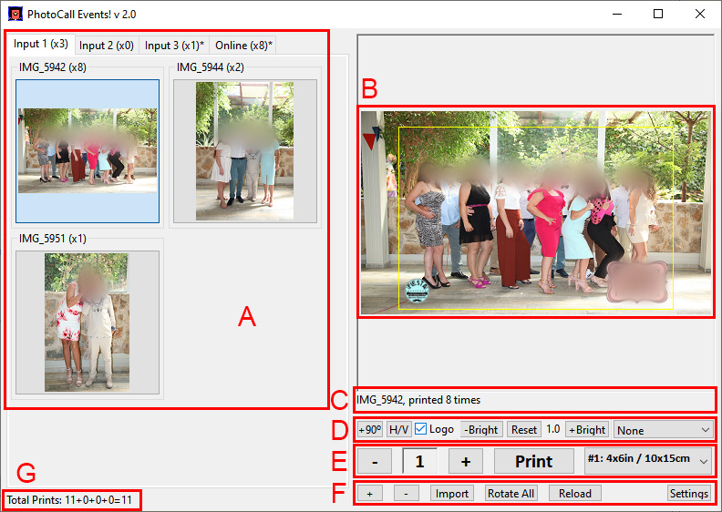 Zona E: Impresión. Con el "-" y el "+" cambia la cantidad de fotos a imprimir de la foto seleccionada. Con el botón "PRINT" las imprime. Con el siguiente botón, puede elegir la impresora en la que se van a imprimir las fotos, de las seleccionadas en los ajustes.